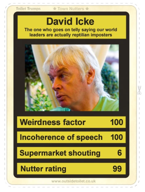 David Icke (29 april 1952) is een Britse ex-voetballer die arthrose heeft gekregen van God, opdat hij zich zo noodgedwongen zou richten op het levenswerk waarvoor hij op aarde gezet is: ons bewust maken van het gevaar dat de Reptilian aliens voor onze planeet betekenen.